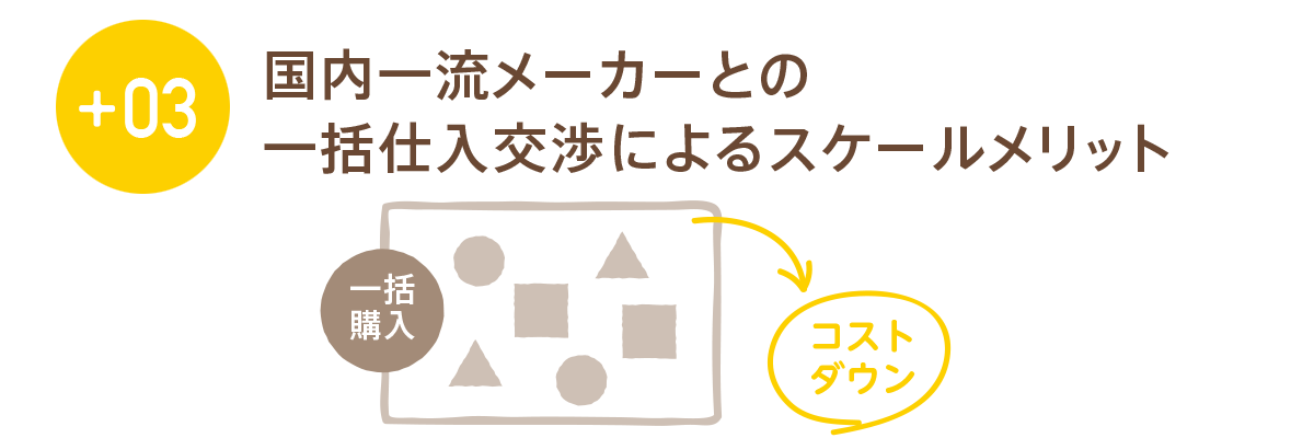 リノーバで使用する設備は、各メーカー様との交渉・ご協力により、当社にて、まとめて仕入れる契約をしております。 このスケールメリットを活用することで、商品の質は落とさずにリーズナブルな価格で、オーナー様に提供することが可能となっております。リーズナブルとは言っても、もちろん各設備は各メーカー様の保証対象商品となっておりますのでご安心ください。