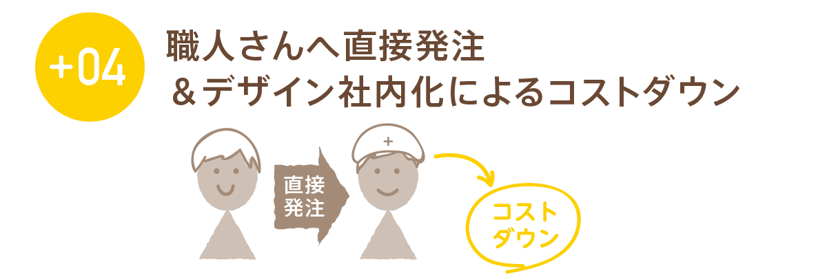 建設・リフォーム業界というのは、一次請け~孫請け、ひ孫請けまであり、直接施工をする職人さんまで何人もの業者さんが介在することが珍しくありません。 リノーバは、職人さんに直接発注することにより中間マージンをカットし、コストダウンにつなげています。また企画・デザインも社内製化することで、オーナー様に安心の定額制でのリノベーションが可能となっています。