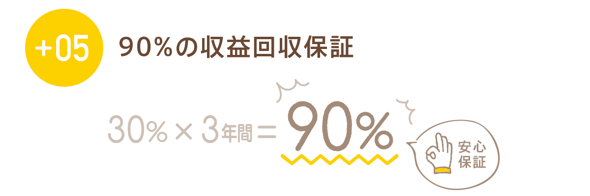 安定収益の確保を目指すオーナー様には、投下資金の30%で3年間家賃保証をいたします。 (30%×3年間=投下資金の90%は確実に回収) このシステムにより、オーナー様と弊社が同じ目線で収益バランスを考えられるのが、 「Reno-Ba」ならではの特徴です。